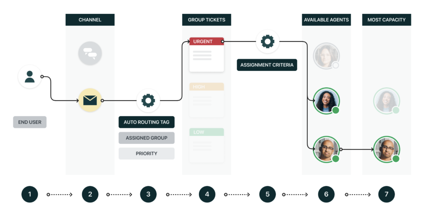 - Entregue las conversaciones con el agente adecuado según su disponibilidad y capacidad, así como la prioridad de la conversación y las habilidades del agente.